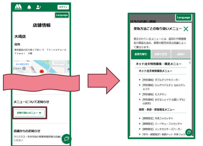 店舗ごとの取り扱いメニューを知りたいです。 店舗ごとの「店舗情報」画面に表示されている「お取り扱いメニュー」ボタンを選択すると、受け取り方法ごとの取り扱いメニューが表示されます。 ※ 表示されているメニューには、品切れや時間限定の商品も含まれます。実際の販売状況は店舗により異なりますので、あらかじめご了承ください。